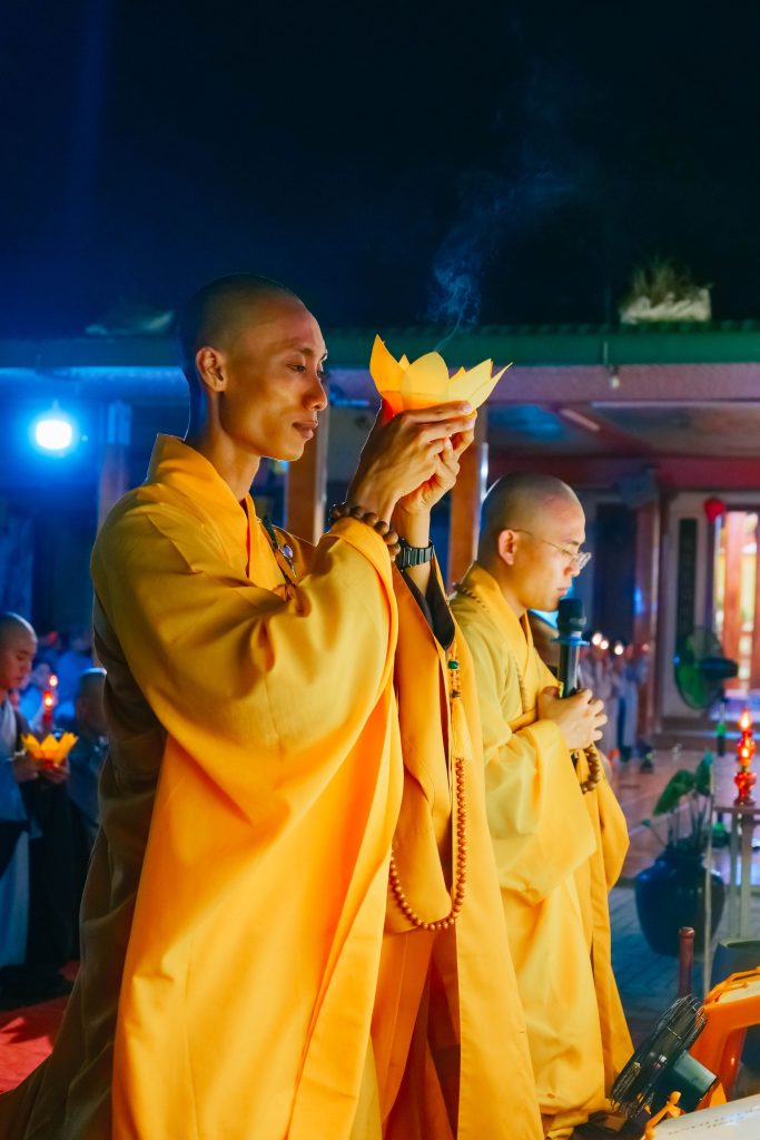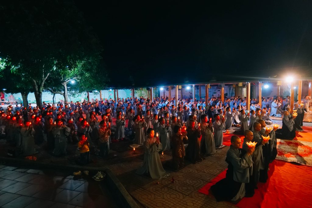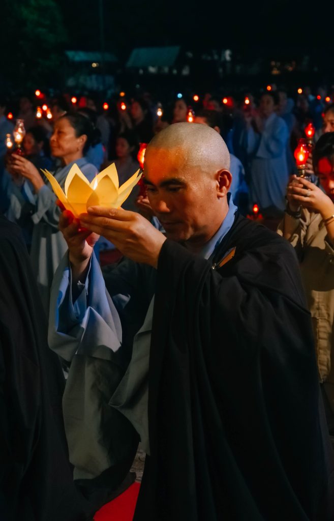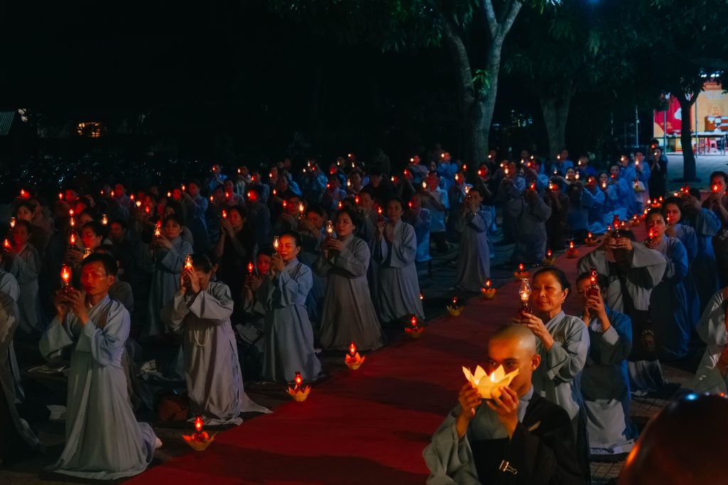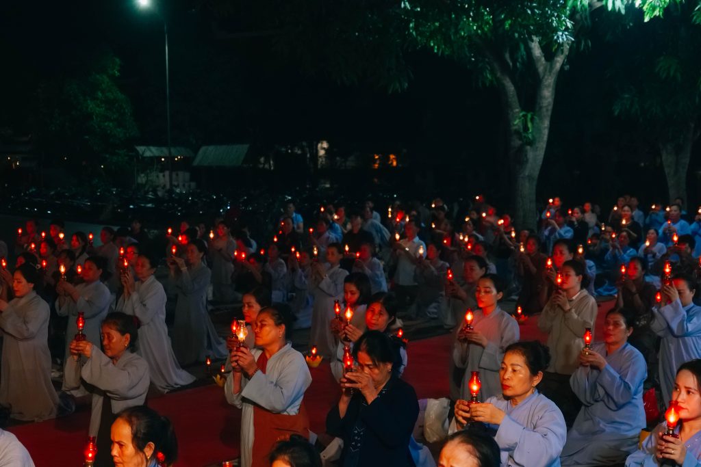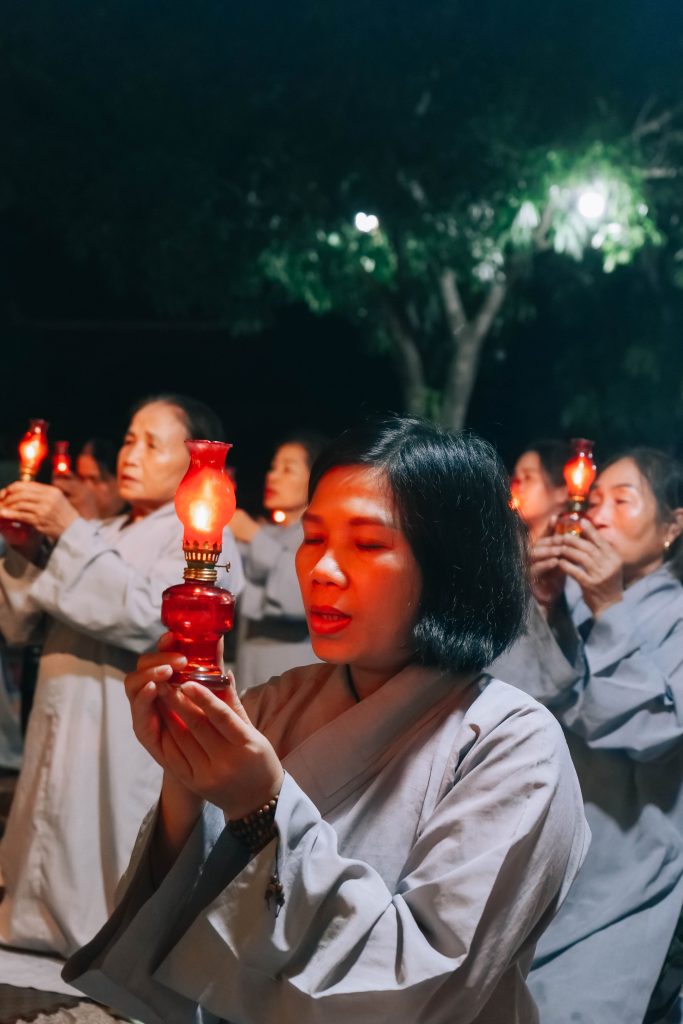 Tiếp nối nghi thức, với tâm thành kính, đại chúng đồng khởi thân đứng dậy. Từng bước chân nhẹ nhàng, chậm rãi tiến về bàn thờ, nâng niu đặt lên đó những ngọn đèn đã thắp. Mỗi ánh lửa nhỏ bé ấy không chỉ là biểu tượng của niềm tin son sắt, của lòng thành kính vô bờ, mà còn là hiện thân cho những lời nguyện ước chân thành, cho khát vọng bình an, trí tuệ và giác ngộ. Mỗi ngọn đèn thắp lên là một lời nguyện noi theo ánh sáng từ bi của Bồ Tát Quán Thế Âm, lan tỏa rạng rỡ khắp không gian và trong sâu thẳm tâm hồn mỗi người.