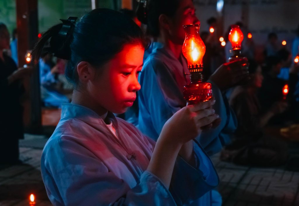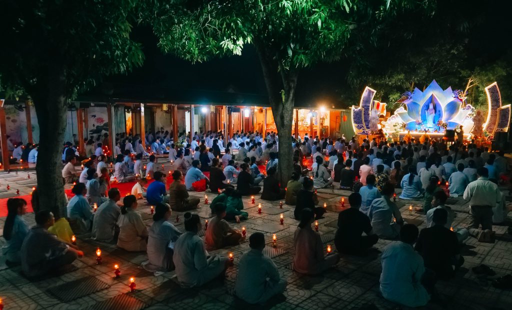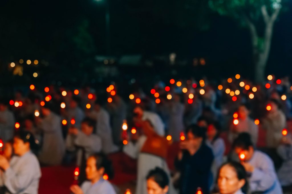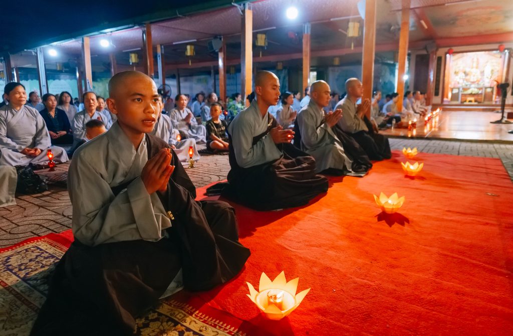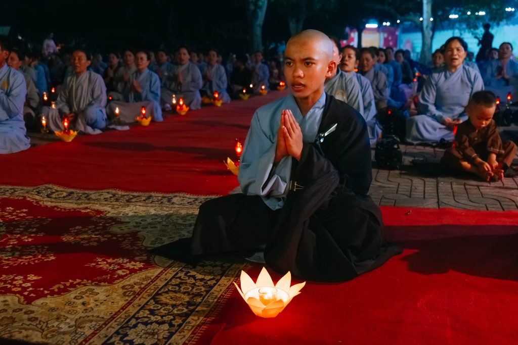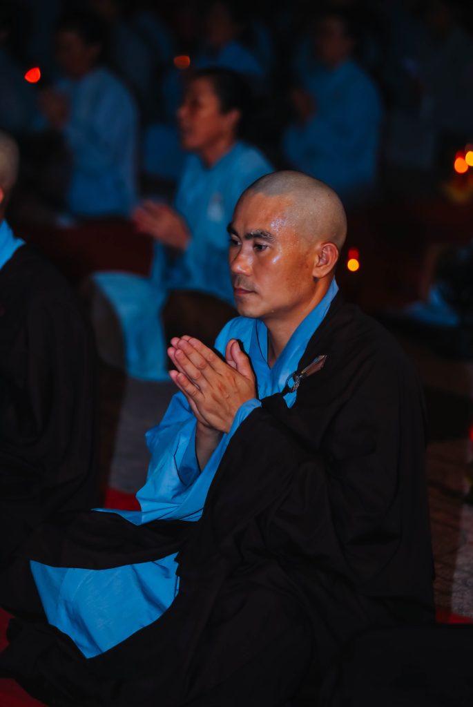 Tiếp nối nghi thức, với tâm thành kính, đại chúng đồng khởi thân đứng dậy. Từng bước chân nhẹ nhàng, chậm rãi tiến về bàn thờ, nâng niu đặt lên đó những ngọn đèn đã thắp. Mỗi ánh lửa nhỏ bé ấy không chỉ là biểu tượng của niềm tin son sắt, của lòng thành kính vô bờ, mà còn là hiện thân cho những lời nguyện ước chân thành, cho khát vọng bình an, trí tuệ và giác ngộ. Mỗi ngọn đèn thắp lên là một lời nguyện noi theo ánh sáng từ bi của Bồ Tát Quán Thế Âm, lan tỏa rạng rỡ khắp không gian và trong sâu thẳm tâm hồn mỗi người.