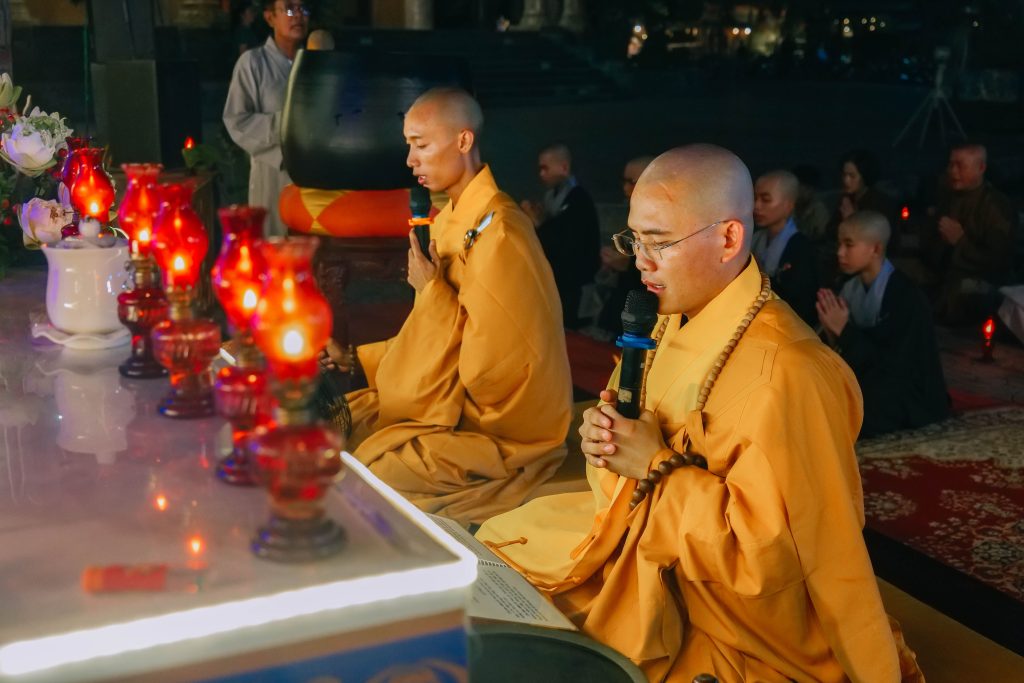 Mở đầu buổi lễ, Chư Tôn Đức đã niêm hương và dâng lời khai bạch lên mười phương chư Phật, chư vị Bồ Tát. Cầu cho quốc thái dân an, mưa thuận gió hòa và chúng sanh an lạc. Sau đó đại chúng đồng thanh trì tụng Chú Đại Bi – thần chú biểu trưng cho năng lực từ bi vô lượng của Bồ Tát Quán Thế Âm. Từng câu chú như dòng suối cam lồ, cuộn chảy qua mỗi tâm hồn, xoa dịu vết thương, tiêu trừ phiền não, mang lại sự che chở và an lạc cho vạn hữu.
