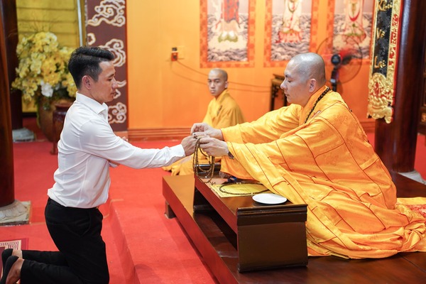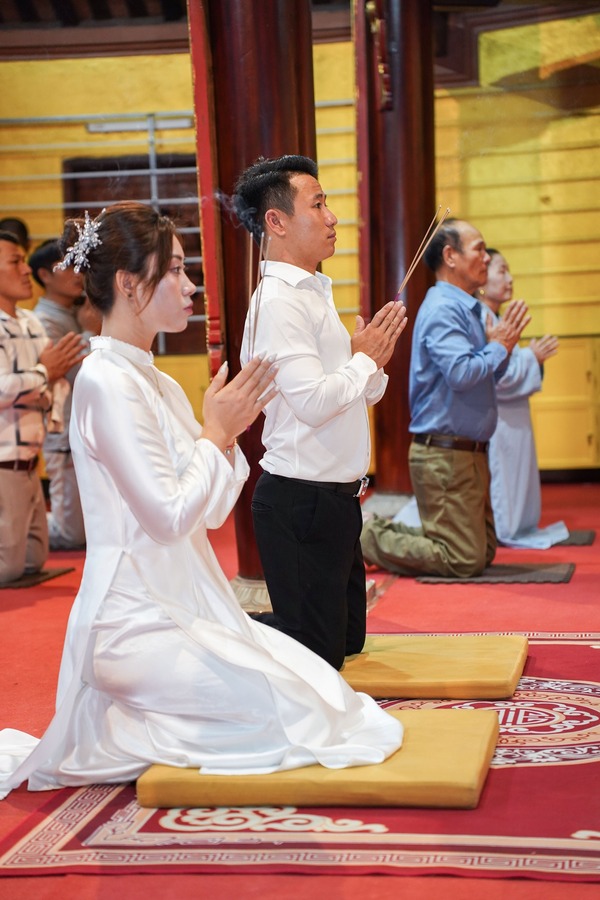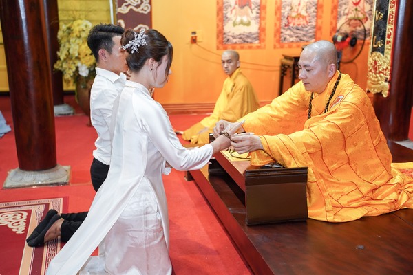Trong không gian trang nghiêm nơi cửa Phật, hai bạn đã cung kính lắng nghe những lời huấn từ đầy từ bi và trí tuệ của Sư phụ trụ trì. Những lời dạy về đạo nghĩa vợ chồng, về sự yêu thương, nhẫn nhịn và thấu hiểu chính là hành trang quý báu, giúp đôi bạn trẻ vững bước trên hành trình xây dựng đời sống hôn nhân bền vững và an lạc.