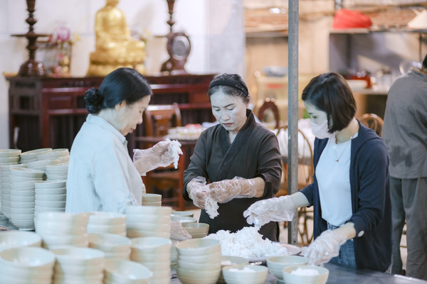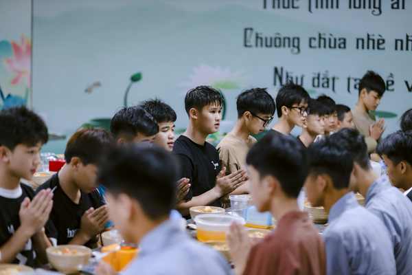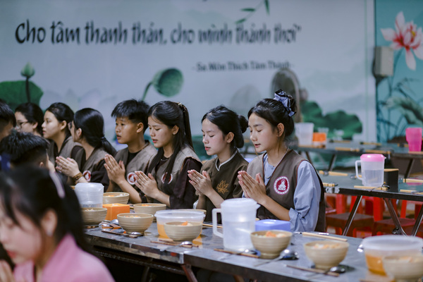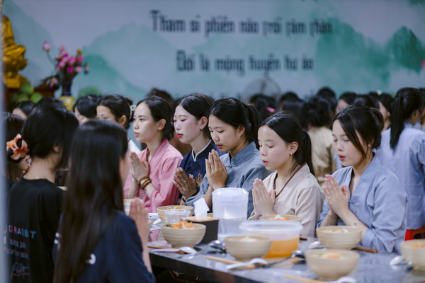 Kết thúc buổi giảng, mọi người cùng nhau thực hành thiền hành trong im lặng, từng bước chân nhẹ nhàng đưa về nhà ăn. Bữa cơm chiều thanh đạm với những món chay giản dị như bún chay, canh rau củ, đậu hũ kho… nhưng chan chứa tình yêu thương và sự biết ơn. Từng muỗng cơm được nâng niu trong chánh niệm, giúp mỗi người thấu hiểu hơn giá trị của sự tri túc và lòng từ bi với vạn vật.